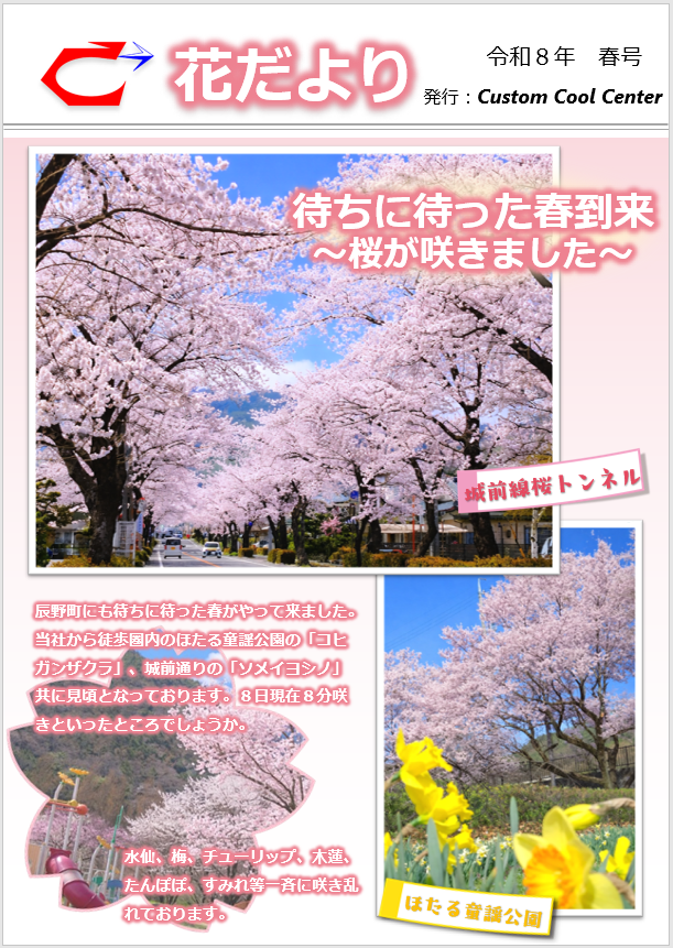 🌸辰野町にも春がやってきました🌸 2026年4月9日2026年4月9日 C3-master 長かった冬も終わり待ちに待った春がやって来ました。桜をはじめ一斉に色々な花が咲きだしました。散歩をするにも良い陽気となっております。時間がありましたら花見をしがてら弊社にもお出かけくださいませ。